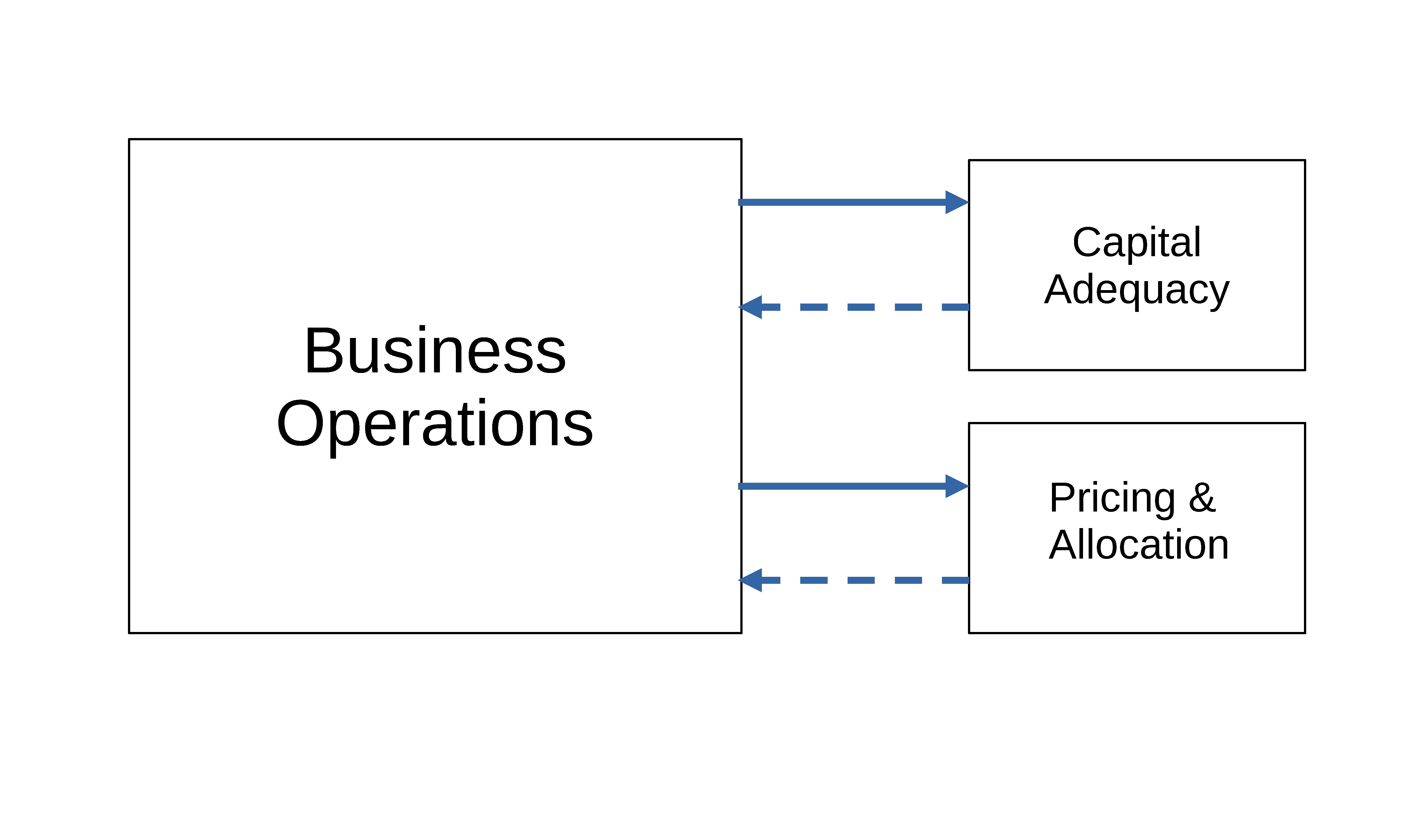 Output from the Business Operations module feeds into the much simpler Capital Adequacy and Pricing & Allocation modules. This is signified by the solid arrows. Dotted arrows signify that these two modules, in turn, affect business operations in the real world and hence, indirectly, the Business Operations module. Indeed, the real-world effect of these modules is the raison d’être of the entire capital modeling system.