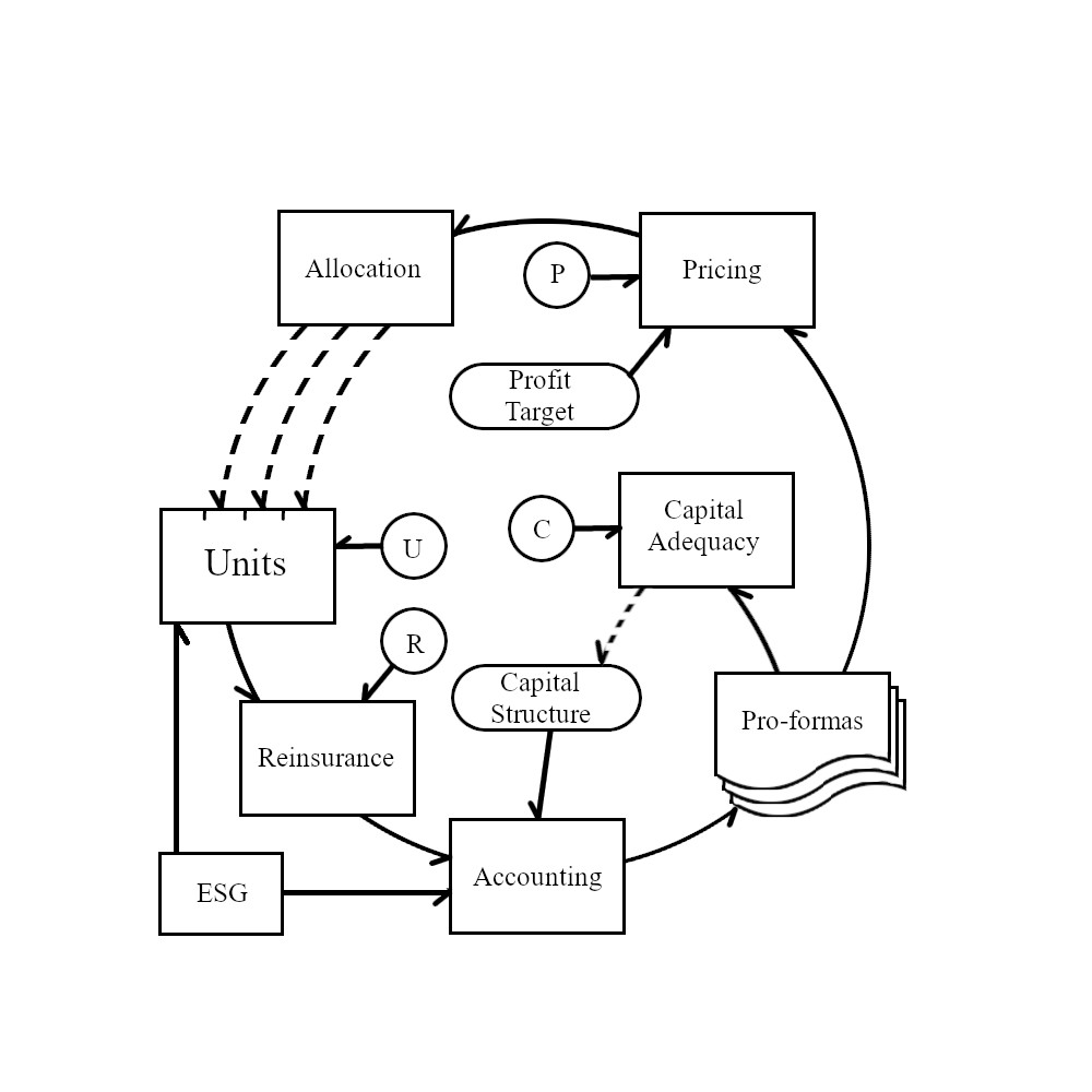 Allocation takes the required portfolio premium as given and allocates the premium (equivalently margin, loss ratio) to the individual units. This information, presumably, has real-world impacts on the units via performance management, risk management, underwriting actions, etc. Impact is represented by the dotted arrows to Units.