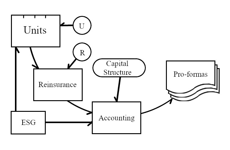 If investment experience is included as one (or more than one) unit, then input from the Economic Scenario Generator (labeled ESG) will be important. This is an optional module which represents external economic factors such as interest rates, returns on various asset classes, rates of monetary inflation, unemployment, etc.