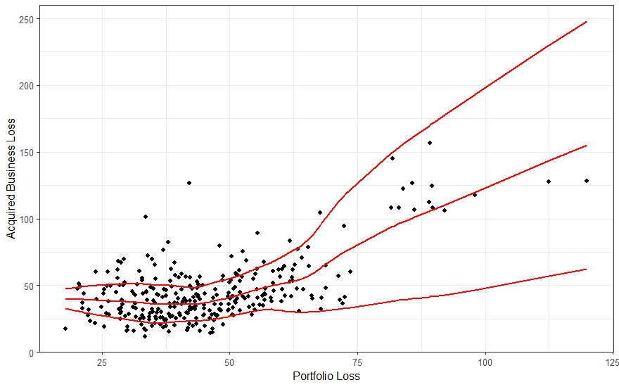 Rather than the conditional mean loss of the acquired business (hereinafter \(X^a\)), we need the entire conditional distribution (or at least a representative sample). There are several technical approaches to this, such as quantile regression (Koenker and Hallock 2001) or kernel smoothing (Wand and Jones 1994). For our example, we will take what is possibly the simplest nontrivial approach.