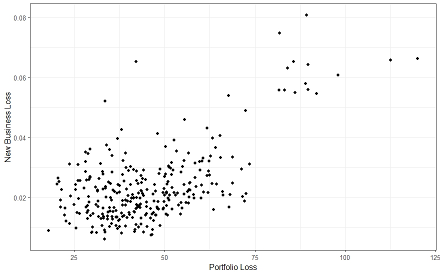 Let’s say for example we have a (relatively) simple cat model through which the portfolio has been run—once, and the results stored—and through which a new business prospect has just been run. Non-cat losses are represented by an independent lognormal variable calibrated on exposure characteristics. The resulting scatter plot is shown in Figure 5.1.