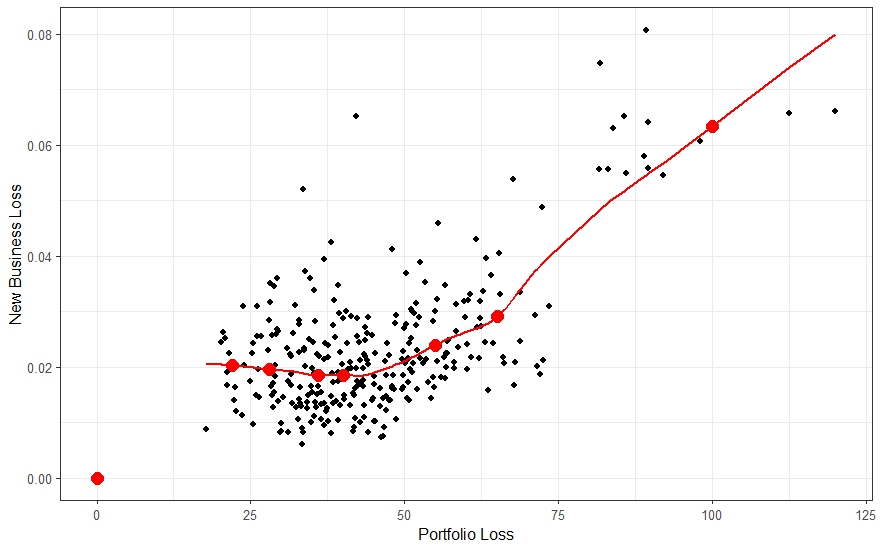 The problem is to translate these results into a form suitable for SRM allocation pricing. One could use the calibrated Wang transform to sort these results by the portfolio loss and calculate distorted probabilities, but we have no guarantee that the surrogate model accurately reproduces the distribution of portfolio losses that the capital model uses. The solution is to extract the conditional expected new business losses for each portfolio loss in Table 5.1. (See the discussion of \(\kappa^i(X_k)\) in Section 4.3).