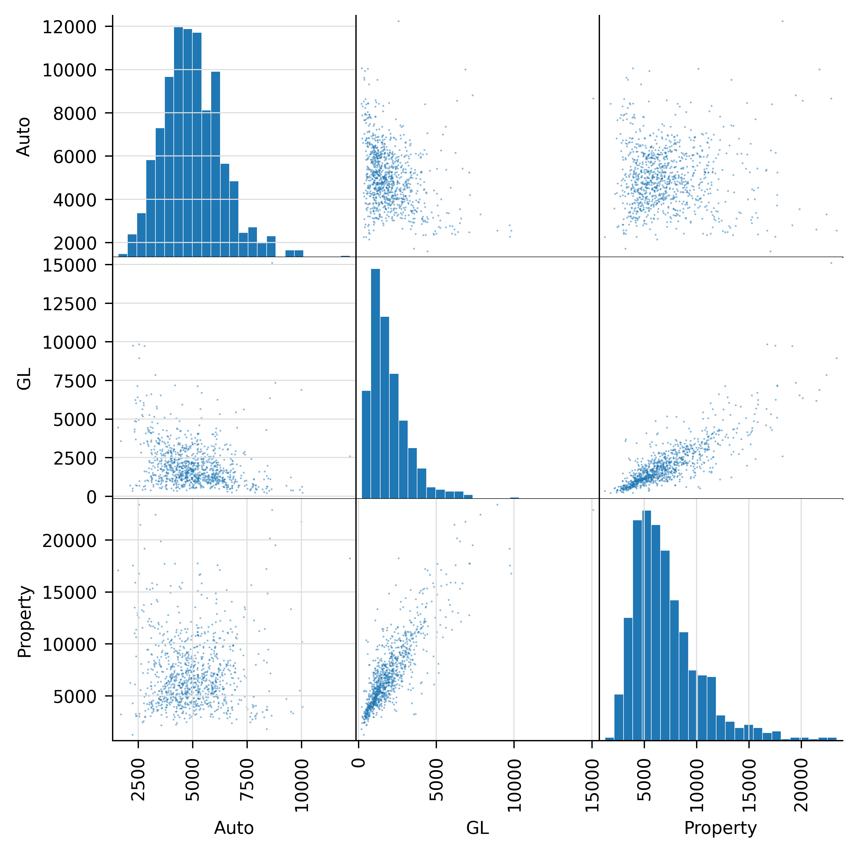 The example works with \(r=3\) different marginals: Auto, general liability (GL), and Property. Losses are simulated using frequency-severity aggregate distributions with a lognormal severity and per occurrence limits. Frequency is a gamma-mixed Poisson (negative binomial) with varying CVs. See Mildenhall (2023) for a description of the aggregate DecL language, used to specify these portfolios.
